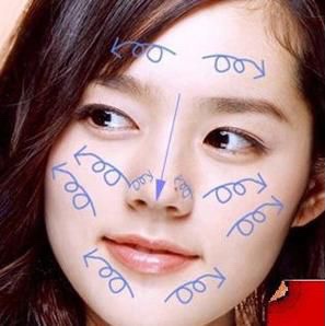 洗面的方向應該是由內向外,下向上的細範圍打圈,不需要很快,我們不需要拼打圈的次數,反而應該有一點力度,用指腹按壓的方式,這樣可以幫助將毛孔內的東西按出來。輕輕的在表面磨擦是不足以接觸毛孔裡面,但打圈按摩的範圍不要太大,因為不是要拉扯皮膚。